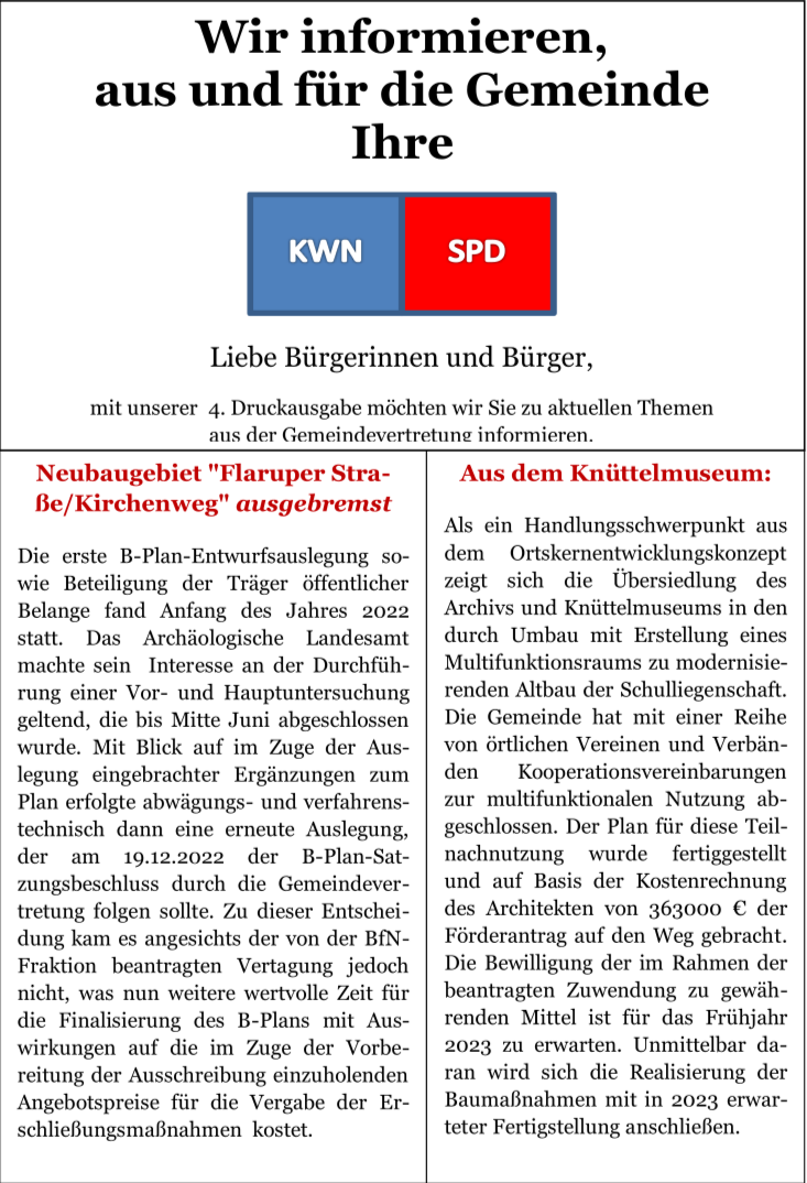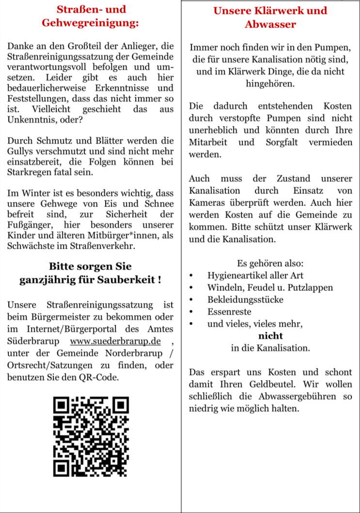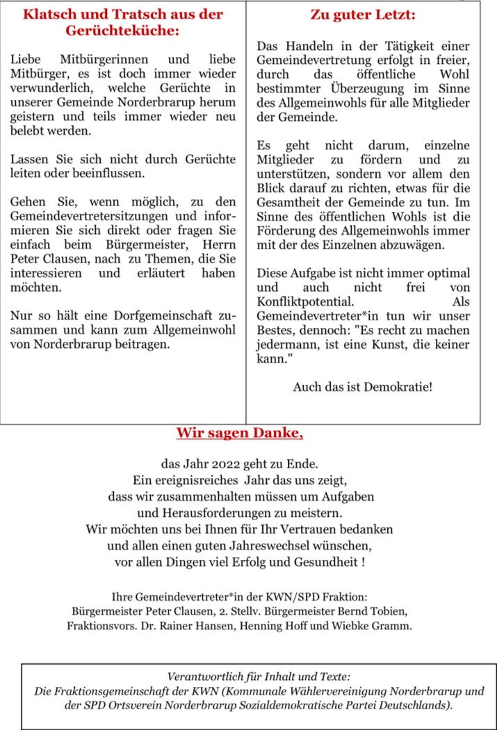 Viele Projekte und Maßnahmen in der Gemeinde Norderbrarup sind auf die Initiative der Mitglieder der KWN-Fraktion zurückzuführen. Auf dieser Basis wollen wir aufbauen und auch weiterhin mit unserem starken Engagement die erfolgreiche Arbeit der KWN-Fraktion in der Gemeindevertretung fortsetzen. Wir haben immer ein besonderes Augenmerk auf Notwendigkeit, Umfang und hohe Qualität der Ausführung von Maßnahmen gelegt. Da die Finanzlage sich nicht verbessern wird, treten wir auch in Zukunft für einen sparsamen Umgang mit knapper werdenden Haushaltsmitteln ein, um nach Möglichkeit Steuererhöhungen zu vermeiden.Unsere Prioritäten sind: