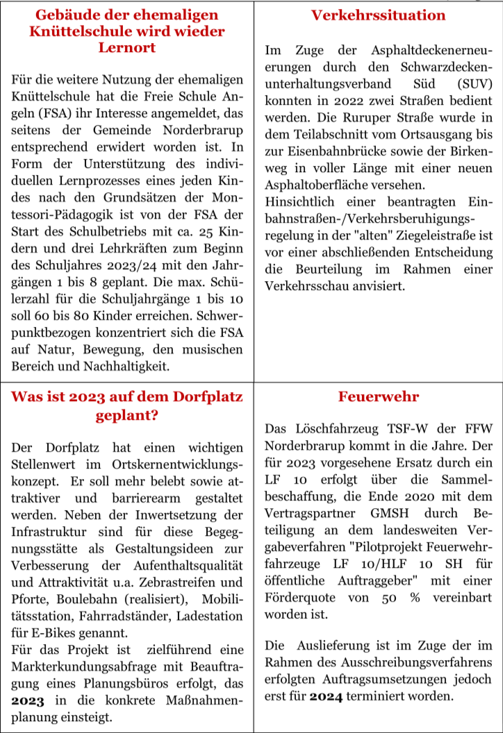 Viele Projekte und Maßnahmen in der Gemeinde Norderbrarup sind auf die Initiative der Mitglieder der KWN-Fraktion zurückzuführen. Auf dieser Basis wollen wir aufbauen und auch weiterhin mit unserem starken Engagement die erfolgreiche Arbeit der KWN-Fraktion in der Gemeindevertretung fortsetzen. Wir haben immer ein besonderes Augenmerk auf Notwendigkeit, Umfang und hohe Qualität der Ausführung von Maßnahmen gelegt. Da die Finanzlage sich nicht verbessern wird, treten wir auch in Zukunft für einen sparsamen Umgang mit knapper werdenden Haushaltsmitteln ein, um nach Möglichkeit Steuererhöhungen zu vermeiden.Unsere Prioritäten sind: